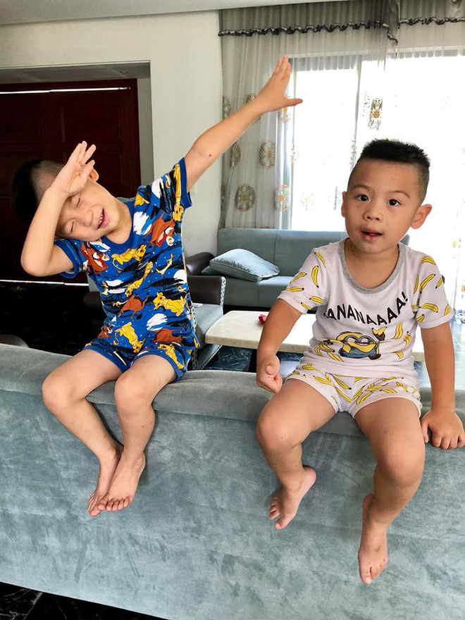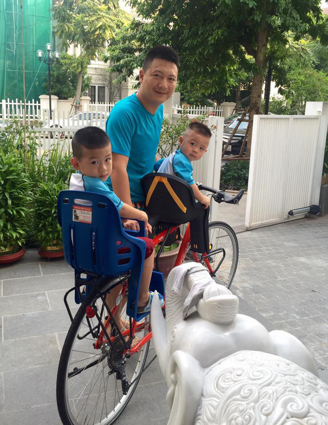Ông xã Ngọc Tiến cùng 2 con đi dạo bằng xe đạp quanh khuôn viên căn biệt thự.