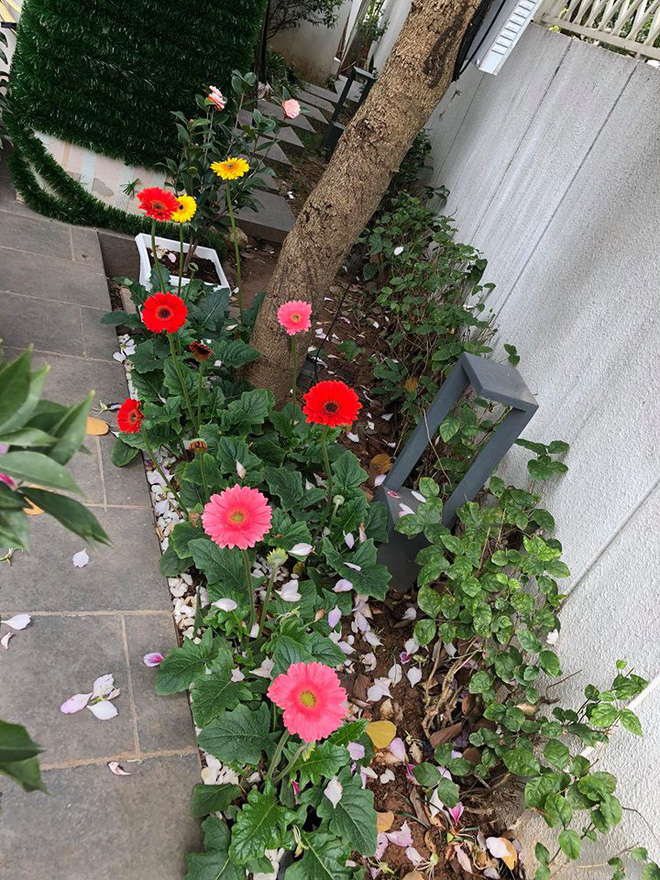 Mỹ Dung trang trí cho khoảng sân vườn của gia đình bằng những chậu hoa rực rỡ sắc màu.