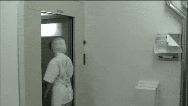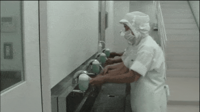 Sau khi thay trang phục và rửa tay, họ sẽ phải đi qua một căn buồng bao gồm các hệ thống khử trùng để làm sạch bụi bặm trên quần áo. Một hạt bụi hay một sợi tóc nhỏ cũng không được phép lọt vào trong dây chuyền chế biến.