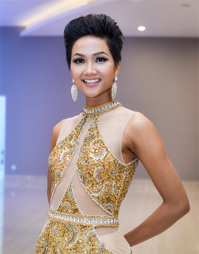 Tân Hoa hậu Hoàn Vũ Việt Nam gây ấn tượng với mái tóc tém cá tính cùng gương mặt sắc nét góc cạnh đậm tiêu chí nhan sắc quốc tế. H'Hen Niê thường xuyên chọn cách trang điểm nhấn đậm vào đôi mắt tạo ánh nhìn sắc sảo.