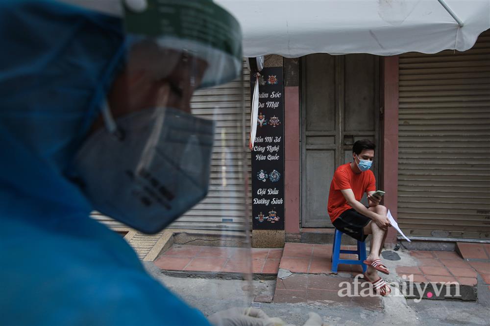Mặc dù thời tiết Hà Nội hôm nay khá nắng nóng, oi bức nhưng mọi người đều tuân thủ quy định ngồi giãn cách trong quá trình lấy mẫu.