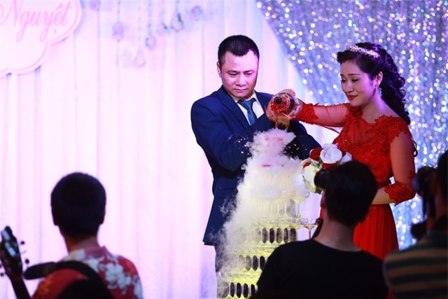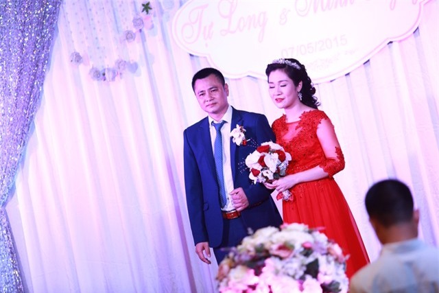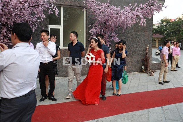 Cô dâu Minh Nguyệt khá bận rộn vì liên tục có bạn bè gọi điện chúc mừng. Trong bộ váy cưới màu đỏ, Minh Nguyệt xinh đẹp không kém hot girl nào.
