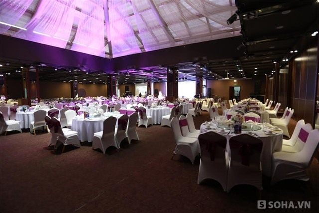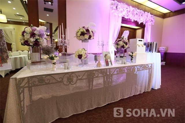Khu vực tiệc cưới được trang hoàng khá sang trọng với màu tím trắng làm chủ đạo.