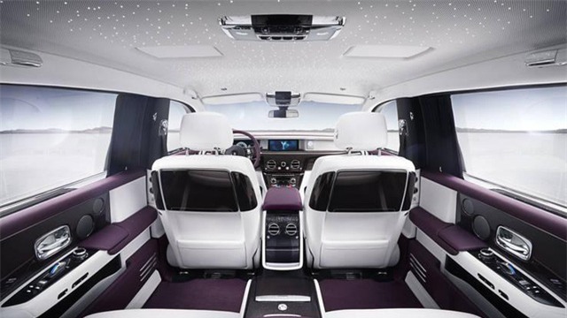 Bề ngoài là như vậy, còn nội thất bên trong thì sao? May thay, Rolls-Royce chưa bao giờ làm các tín đồ của mình thất vọng, vẫn là nét xa hoa vốn có đậm chất Anh quốc. Với Phantom VIII, bạn thậm chí còn được ngắm sao ngay trong xe, được xem phim và nhâm nhi một ly champagne thượng hạng. Trung tâm bảng điều khiển là màn hình tràn viền 12,3 inch; chủ nhân có thể chọn bất kỳ vật liệu nào mình thích, từ gỗ, da thậm chí là lụa. Ngồi ở ghế sau, bạn có thể xem phim hoặc làm việc thông qua một màn hình ẩn ở lưng ghế trước.