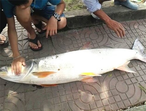 Nhiều người dân thích thú khi nhìn thấy con cá măng khổng lồ |