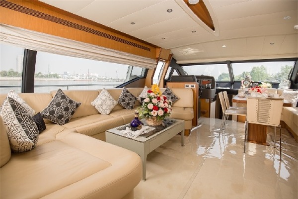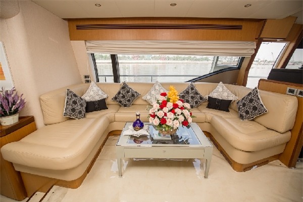Phòng khách sang trọng được bài trí tinh tế trên du thuyền. Bên cạnh
