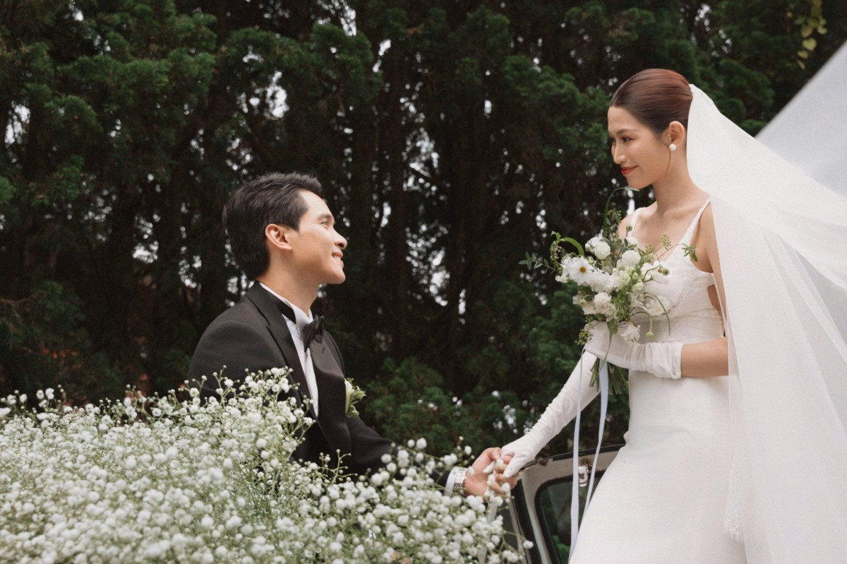 Xuất hiện trong đám cưới, cô dâu Quỳnh Châu xinh đẹp trong chiếc đầm cưới phom dáng đuôi cá tôn trọn vóc dáng. Người đẹp chọn kiểu tóc búi thấp khoe trọn visual sáng trưng. Trong khi đó, chú rể lịch lãm, bảnh bao với áo vest trắng và quần âu đen. Cả hai được khen vô cùng đẹp đôi.