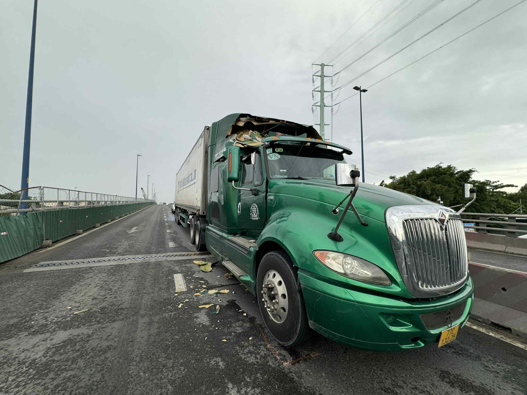 Đến đoạn qua nút giao Mỹ Thuỷ, cần cẩu bên trong công trình xây dựng hoàn thiện dự án nút giao Mỹ Thuỷ hơn 3.400 tỷ đồng bất ngờ gặp sự cố, ngã ra đường. Một xe container và ô tô 7 chỗ bị cần cẩu đè lên, hư hại nặng.