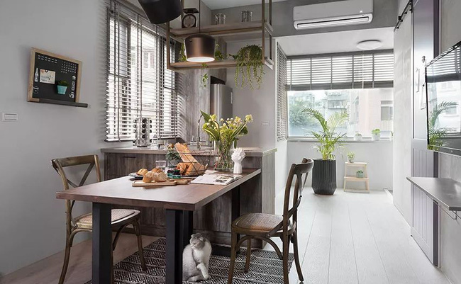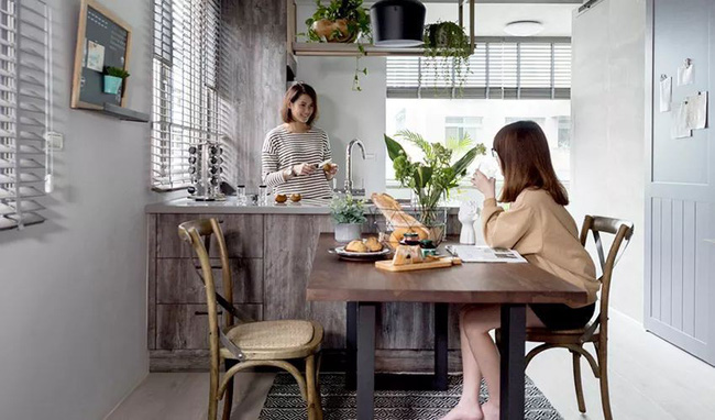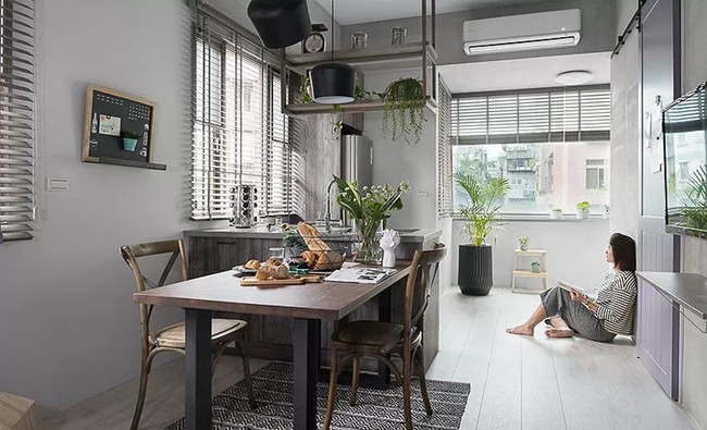 Không gian sử dụng màu trung tính nhưng vẫn đủ để mọi người cảm thấy ấm áp, vui vẻ nhờ decor thêm điểm nhấn từ cây xanh và ánh sáng vàng. Góc ăn uống cũng đồng thời là nơi thư giãn, đọc sách, làm việc, thậm chí là xem tivi.