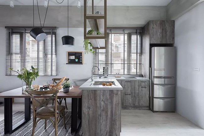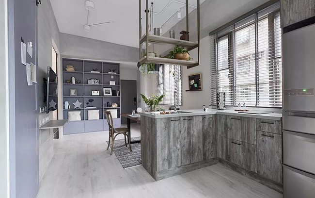 Góc bếp lung linh, xinh tươi hơn khi có thêm kệ gỗ treo phía trên bar cùng hệ thống đèn chiếu sáng mang lại cảm giác đậm chất Bắc Âu cho từng góc nhỏ.