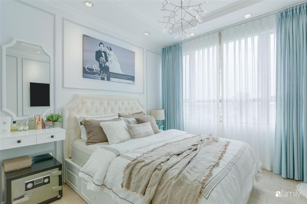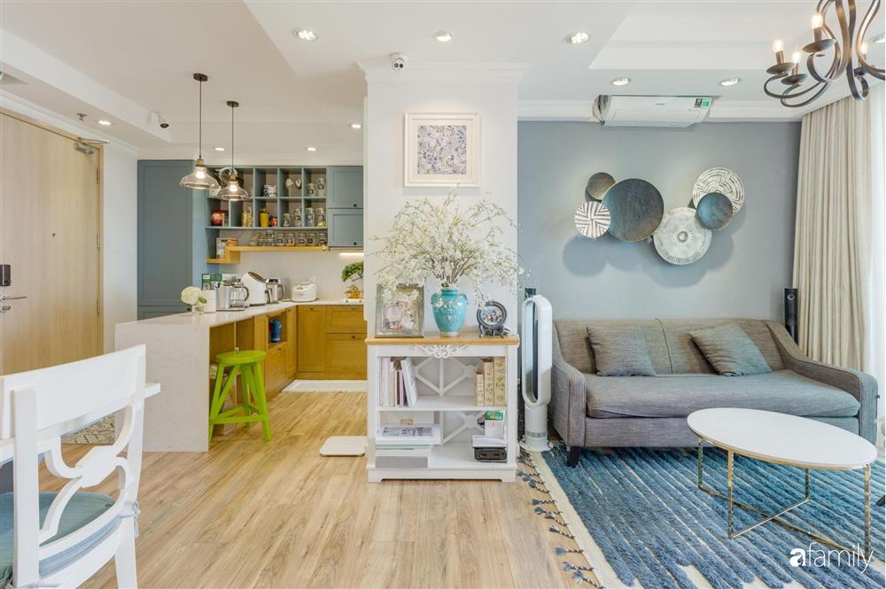 Không gian phòng khách được bố trí ở ngay khu vực ban công, nơi có nhiều ánh sáng tự nhiên. Màu trung tính với sắc độ sáng giúp cho điểm nhấn từ màu xanh dịu trở nên mềm mại và duyên dáng hơn.