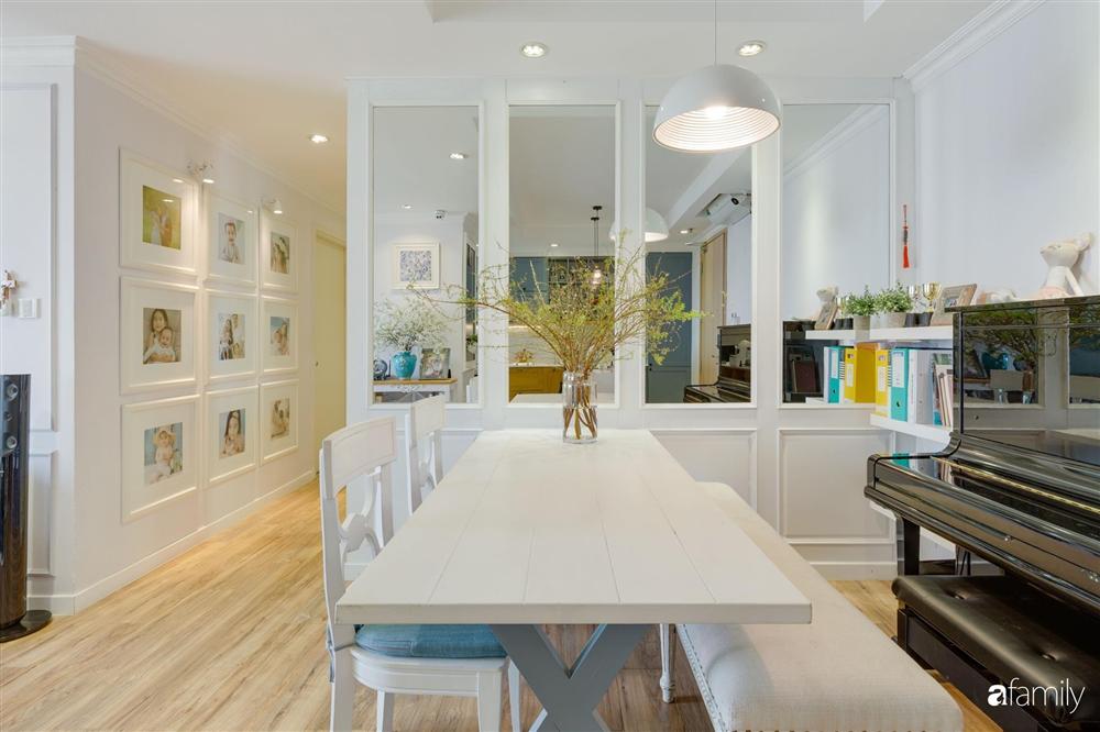 Góc ăn uống được bố trí ngay cạnh khu vực phòng khách. Khu vực chức năng này được lựa chọn màu trắng làm gam màu chủ đạo để tăng diện tích cho không gian. Ánh sáng từ ban công vẫn được xuyên suốt mọi góc nhỏ giúp góc ăn uống thêm rộng rãi.