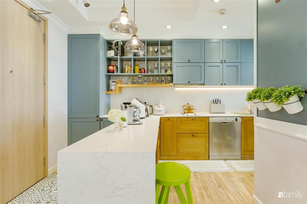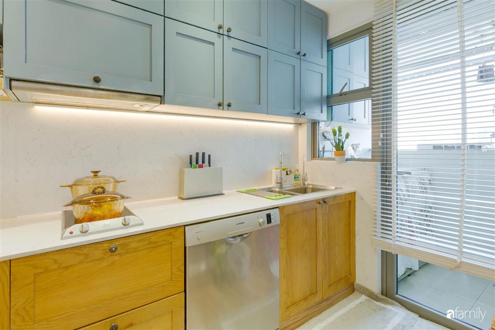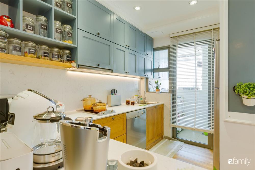 Tủ bếp trên và dưới được thiết kế gọn gàng, ngăn nắp.