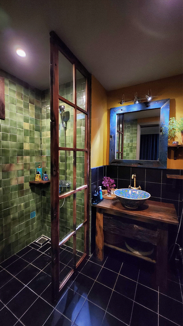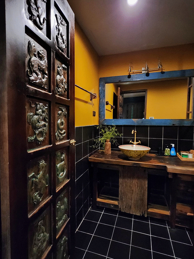 Cánh cửa nhà vệ sinh đối diện cửa ra vào được biến tấu thật đẹp, làm điểm nhấn cho khách vào đứng tựa....chụp ảnh