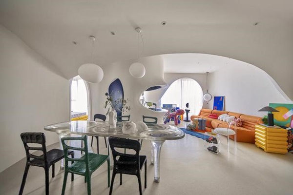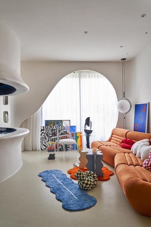 Nhiều màu sắc đã được sử dụng trong căn hộ độc thân này, từ đồ nội thất và tranh ảnh, cũng như nhiều hình khối trong các ngôn ngữ thiết kế Retro, Art-décor. Căn hộ tận dụng được ánh sáng tự nhiên, những đường lượn thông thoáng sẽ đón ánh sáng mặt trời chiếu vào tận các góc cần thiết của căn hộ. Vào ban đêm, "hang động" này có thể thay đổi thành một không gian lấy cảm hứng từ những bộ phim thập niên 60 70, để phù hợp với những giai điệu mà gia chủ sẽ phiêu một cách ngẫu hứng.