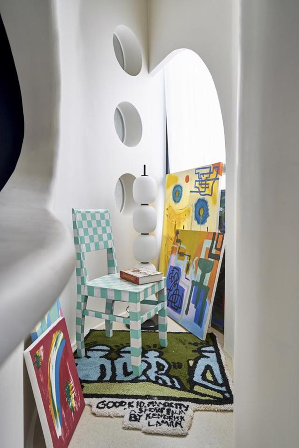 Bởi vì khu vực làm việc - chính là góc mix nhạc DJ - được tạo nên như một "đài quan sát" nhỏ ở đối diện phòng khách, không gian thừa ra một góc khá khó để sử dụng. Các kiến trúc sư đã quyết định đặt vào đó một số tác phẩm nghệ thuật trang trí, đồng thời kèm theo một cửa sổ để không làm át không gian xung quanh.