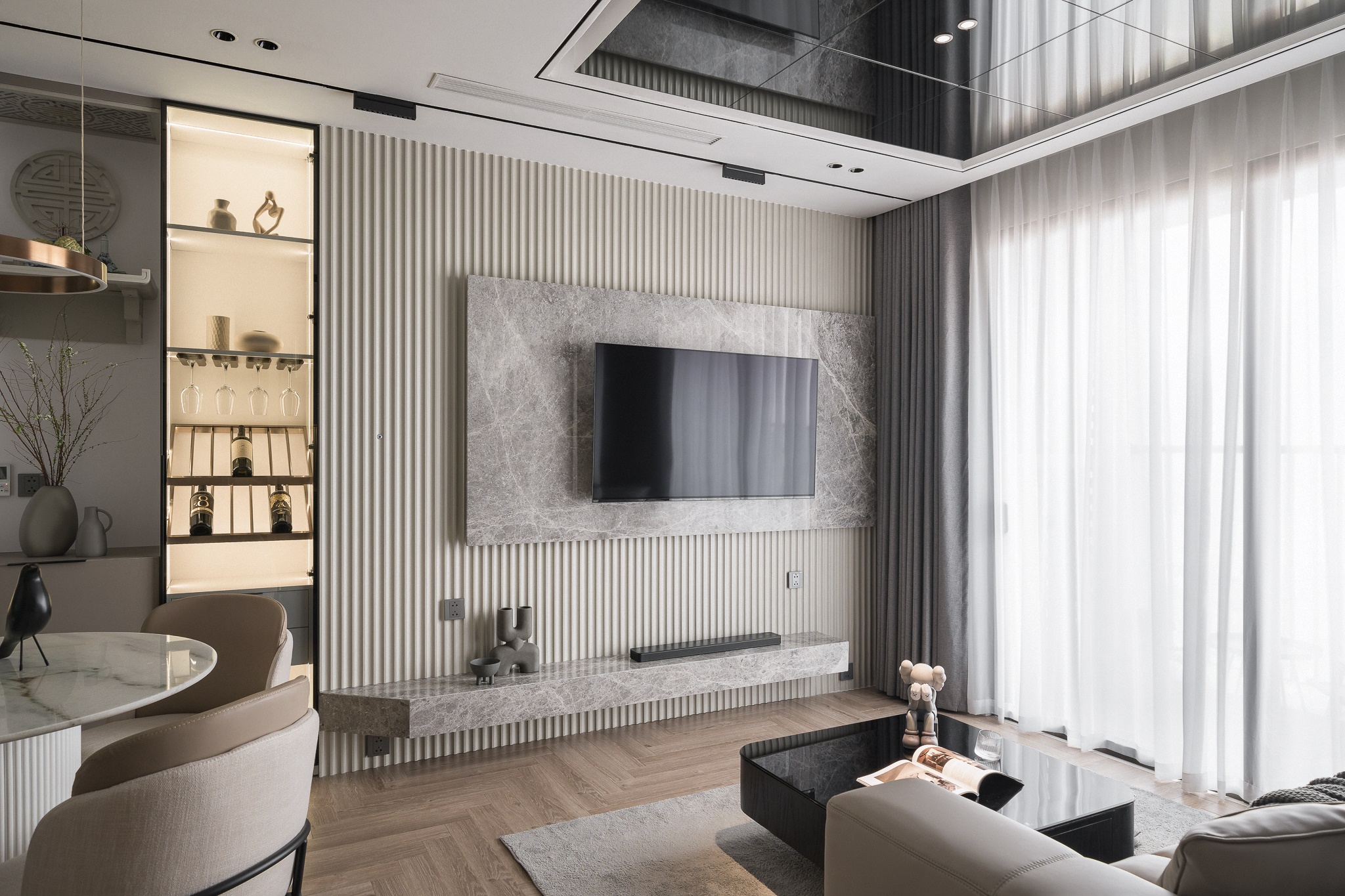 Lối thiết kế hiện đại gam màu xám, be và trần ốp gương tinh tế tạo nên nét nổi bật, sang trọng cho phòng khách.