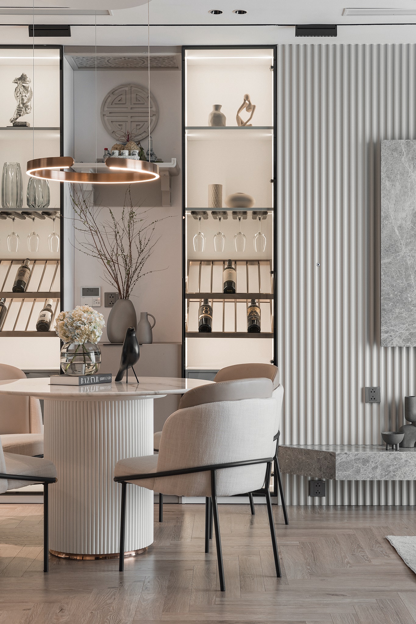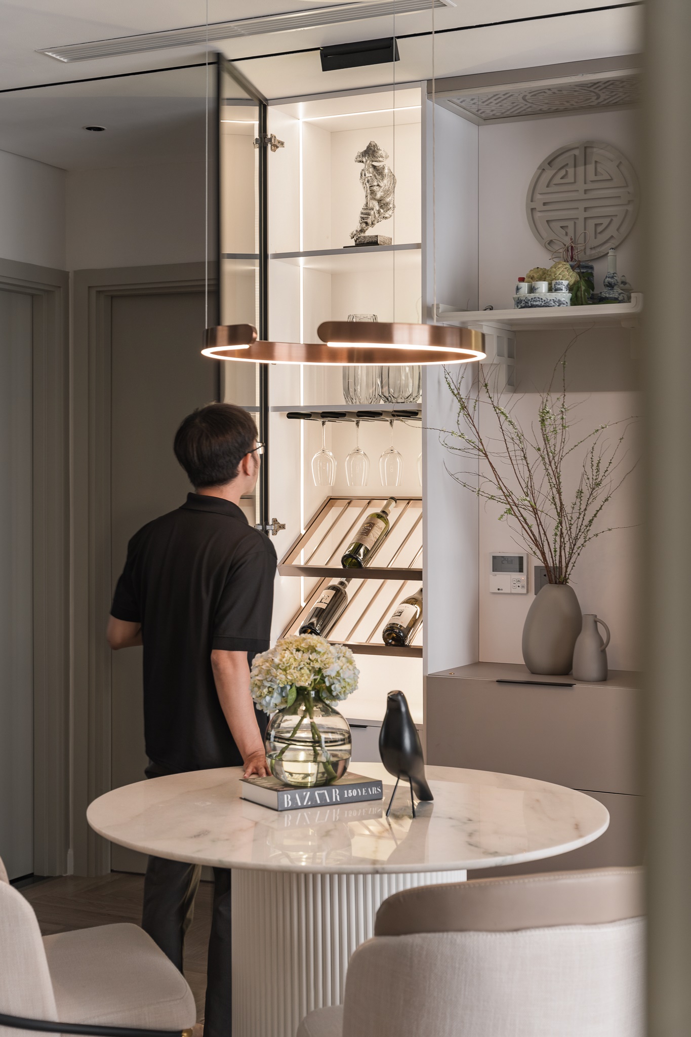 Bàn ăn, tủ rượu và lối giao thông vào các phòng chức năng khác. Chi tiết mạ vàng ở nội thất giúp tăng tính thẩm mỹ và tạo điểm nhấn.