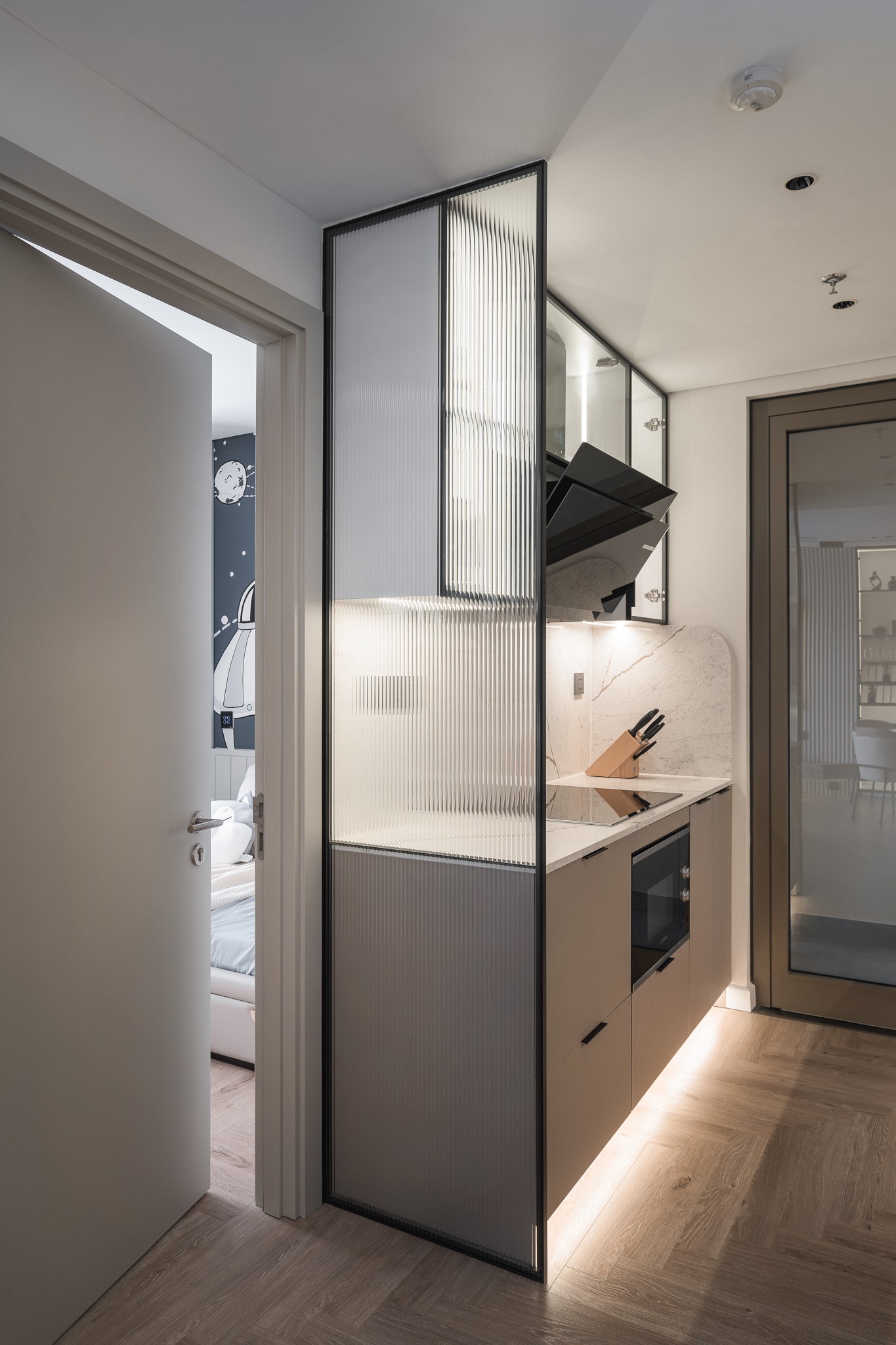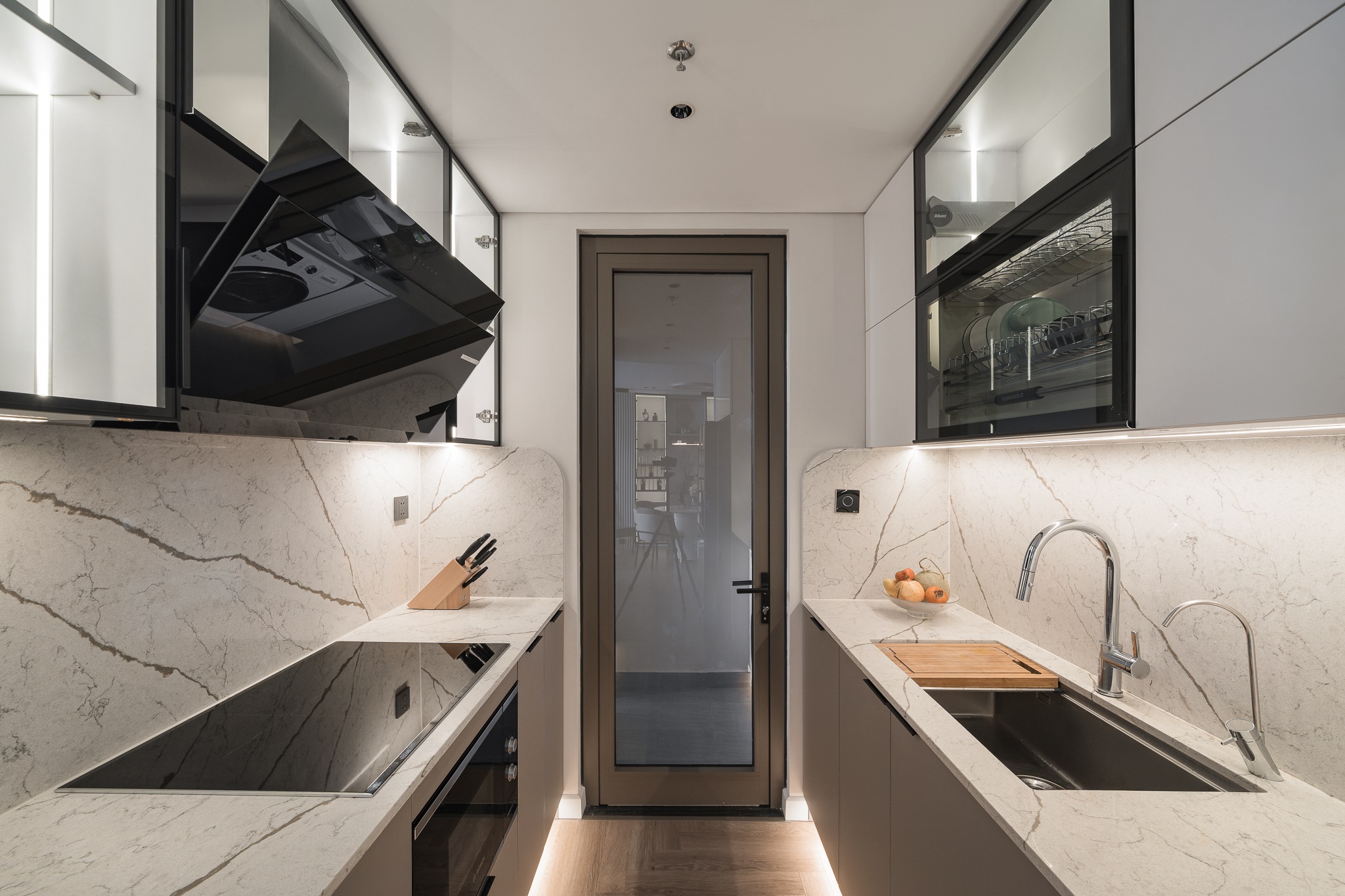 Góc bếp nhìn từ bàn ăn vào. Sàn gỗ màu vàng nhạt đơn giản. Các thiết kế hiện đại ngày nay gắn với sự tối giản, tinh tế nhưng không làm mất đi thẩm mỹ.