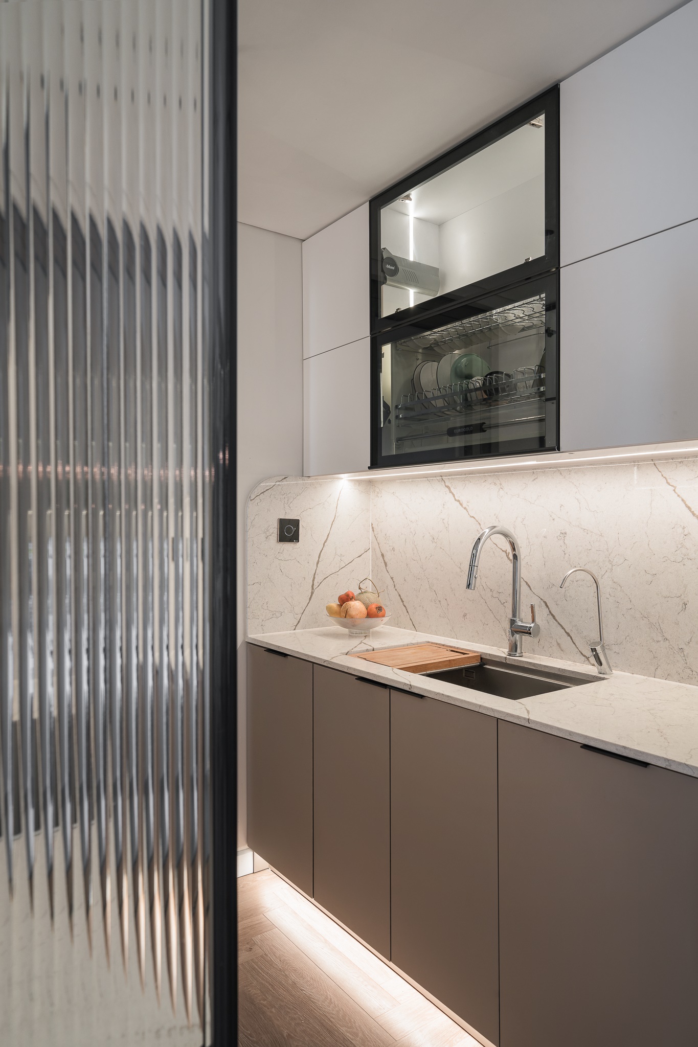 Khu bếp ngăn với phòng khách bằng lớp kính vân sóng mờ. Bồn rửa 1 hố hiện đại, kết hợp thớt. Tủ bếp bằng chất liệu chống ẩm, bền vững.