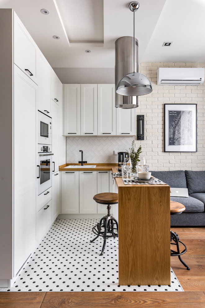 Tóm lại, căn hộ nhỏ này là sự kết hợp hoàn hảo giữa vẻ hiện đại và cổ điển. Mặc dù phòng khách và nhà bếp nằm trong một không gian, các khu vực của chúng vẫn được ngăn cách bởi các phong cách thiết kế khác nhau, khiến chúng trở nên độc đáo và nổi bật.