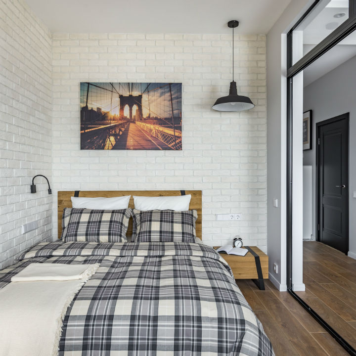 Tiếp tục là gam màu trắng theo tới trong phòng ngủ, nhưng tại đây, chủ nhân đã linh hoạt hơn khi kết hợp thêm hoa văn caro sọc xám thời thượng.