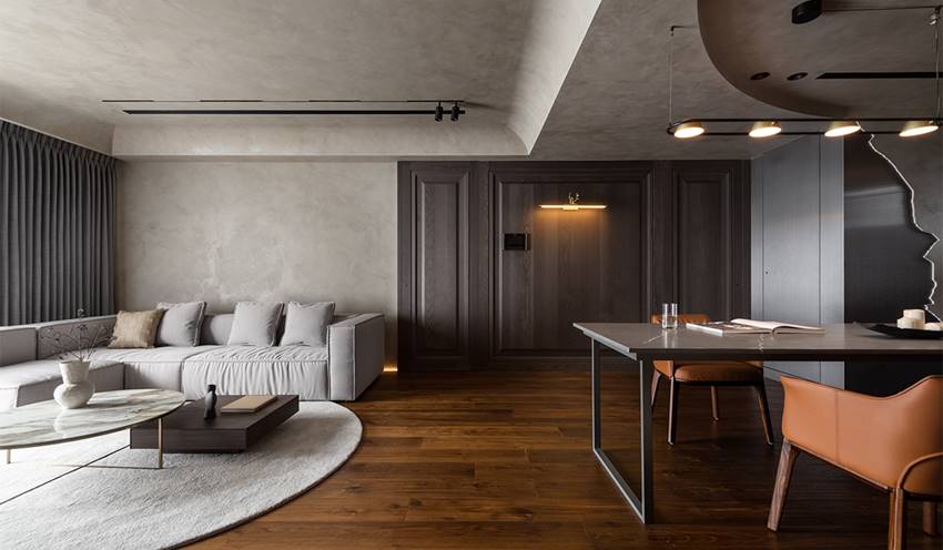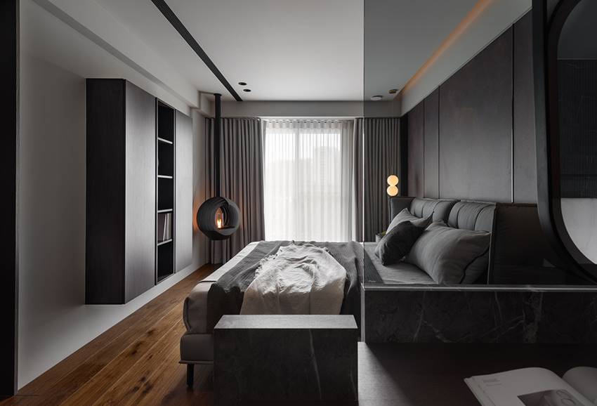 Màu sơn xám lạ mắt được đẩy suốt từ trần xuống bức tường sau của ghế sofa. Ngoài hình dạng, nó có thể điều chỉnh độ ẩm trong nhà tốt hơn và làm nổi bật màu xám be nhẹ nhàng và trang nhã của ghế sofa vải. Bức tường vân gỗ đối xứng thu vào tầm mắt mang đến đường nét sang trọng và thanh lịch, đồng thời khéo léo ẩn đi khung cửa phòng ngủ cùng màu, biến nó thành vô hình trong nháy mắt.