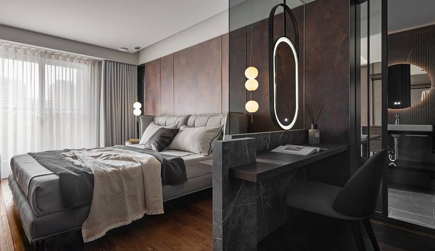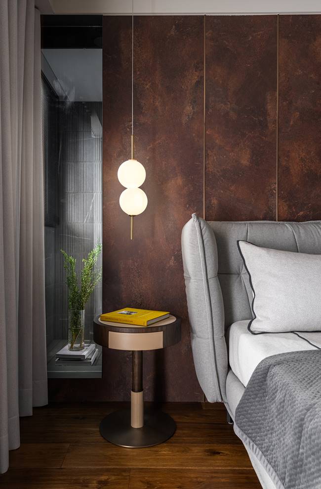 Bức tường chính bằng đồng đỏ lạ mắt kết hợp với hệ thống sàn nhà và tủ gỗ có tông màu trầm tĩnh, những dải kim loại trang trí cùng đèn chùm ấn tượng, tinh tế đã tạo nên một phòng ngủ sang trọng và cá tính.