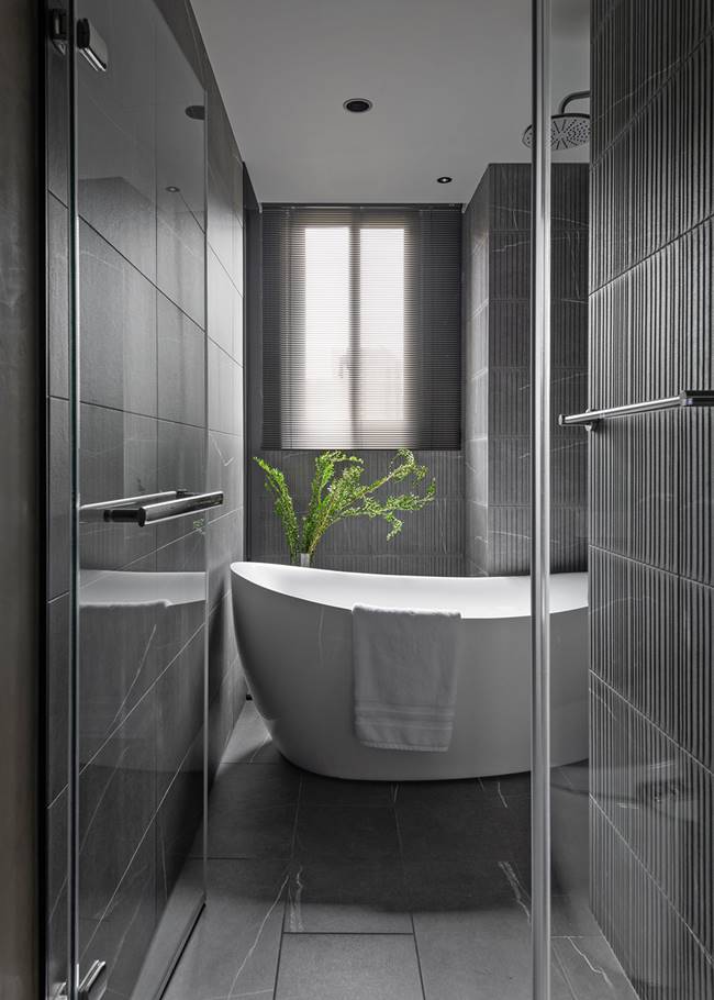 Khung cảnh được mở rộng bên hông của giường và dẫn đến góc phòng tắm. Ở đó có một bệ nâng cao bên cạnh bồn tắm, là nơi đặt cây xanh, khéo léo đưa thiên nhiên sinh động vào phòng.