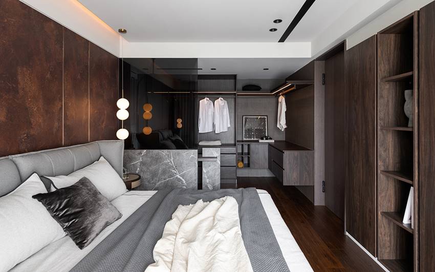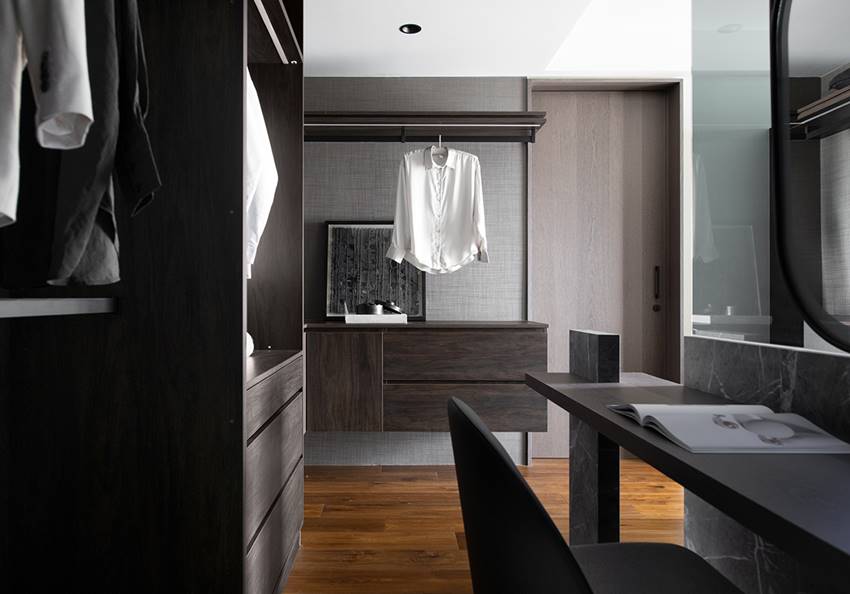 Giấy dán tường vải nền màu xám được kết hợp với tủ gỗ để mở ra phía bên kia của bố cục. Đó là khu vực phòng thay đồ, được phân chia thêm bởi một bức tường thấp bằng đá và kính đen. Phòng thay đồ mở này sử dụng không gian hành lang ban đầu để tìm ra cấu hình hoàn hảo cho số lượng quần áo khổng lồ của chủ nhân.