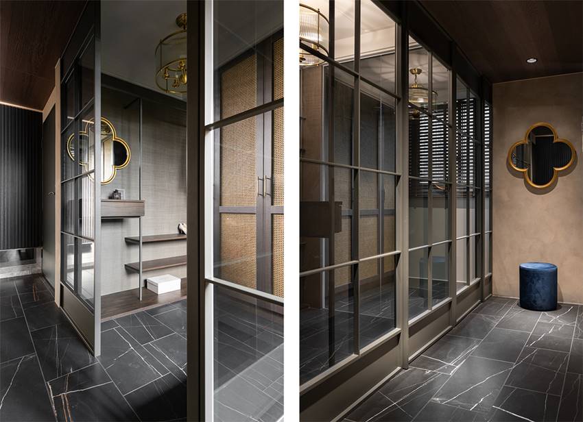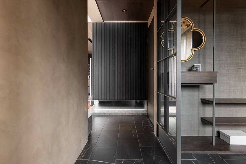 Hoa văn đá đen sâu trải rộng ở lối vào, dẫn đến tủ giày ẩn sau lưới tản nhiệt màu đen tuyền. Sau đó là phòng áo choàng và kho chứa đồ ở bên cạnh, thuận tiện cho việc cởi bỏ trang thực, đồ dùng mỗi khi đi ra ngoài về và thực hiện vệ sinh phòng dịch, tiêu độc khử trùng.