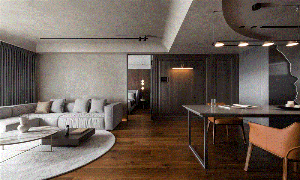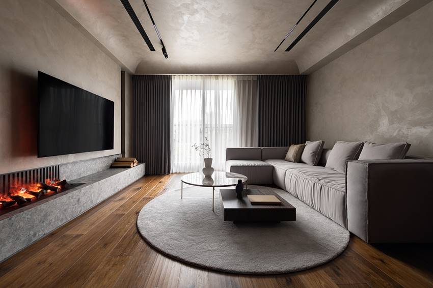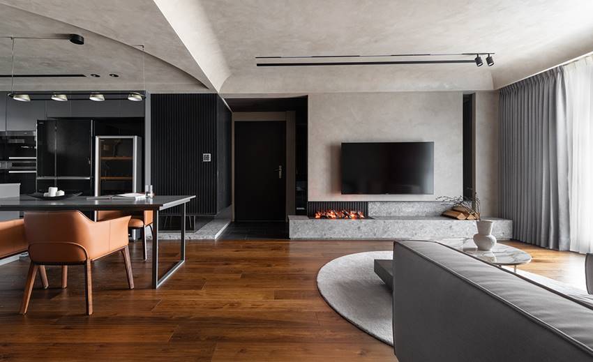 Khi bước chân bước lên sàn gỗ chắc chắn, sàn nhà xác định vận trình của ngôi nhà và vén bức màn chào đón. Một bệ màu xám chạy dài xuất hiện phía trước bức tường TV để hướng dẫn hướng của đường di chuyển, đồng thời tích hợp một lò sưởi mini mà các cặp đôi mơ ước.