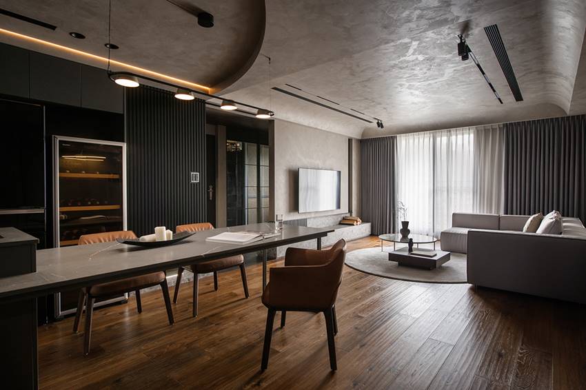 Sàn nhà được lát bằng những đường vân gỗ tối màu chắc chắn với kết cấu ba chiều tạo nên nhịp điệu tự nhiên giữa các hoa văn và vết bẩn hỗn độn. Trần nhà được thiết kế mái vòm với những đường vòng cung khéo léo bao bọc không gian phòng khách một cách nhẹ nhàng.