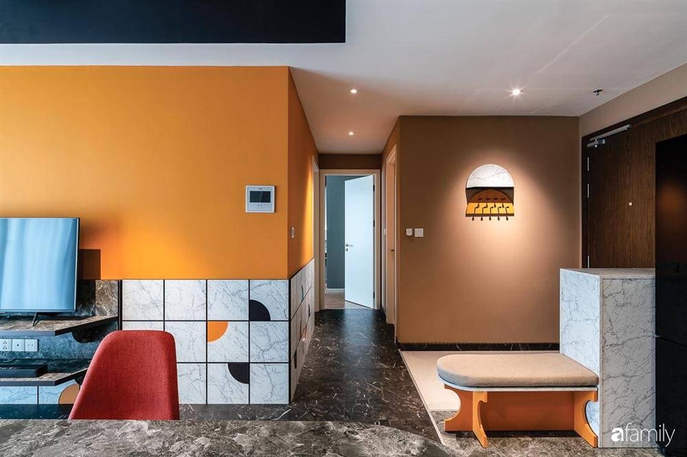 Một điều dễ nhận thấy khi ngắm nhìn căn hộ chính là sự kết hợp hài hòa giữa hình khối và màu sắc. Ưu ái cho những gam màu cá tính như cam, đỏ gạch làm điểm nhấn, các KTS khéo tô vẽ cho không gian nét đẹp ấn tượng từ những đường cong, vừa để thể hiện cá tính của gia chủ vừa tạo độ "sâu đậm" cho không gian.