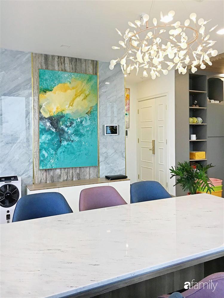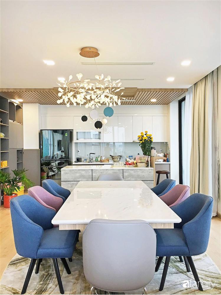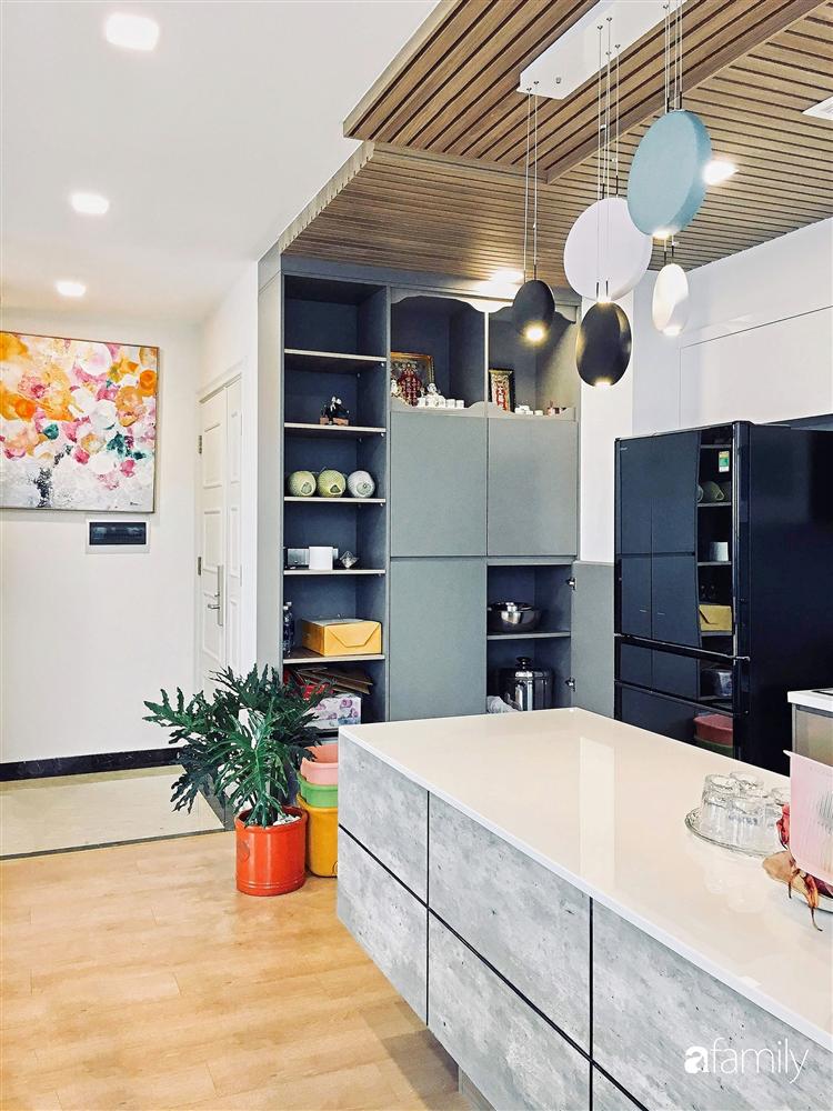 Ở khu vực nấu nướng còn được nhà thiết kế Mai Thanh Huy linh hoạt và sáng tạo bằng việc thiết kế quầy bar lớn hiện đại ở giữa, kết nối bếp và bàn ăn cùng đèn màu trắng và xanh đậm, nhạt được nhập khẩu từ Italia làm tăng vẻ đẹp sang trọng và ấn tượng cho căn hộ.