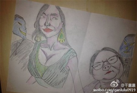 Mới đây, chân dài 8X này bất ngờ up lên mạng bức tranh biếm họa vô cùng hài hước của mình và mẹ ruột. Can Lộ Lộ khoe đây chính là tranh do cô nàng tự vẽ để thư giãn tinh thần. Người xem có thể thấy vòng 1 của Lộ Lộ được đặc tả rất rõ trong tranh. Gương mặt béo mập của mẹ Can Lộ Lộ khiến ai nấy đều không thể nhịn cười.