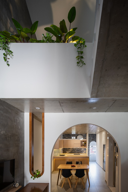 Mong muốn của gia đình là có một không gian sống thoáng đãng, gần gũi với thiên nhiên và phù hợp với nhu cầu sinh hoạt chung của tất cả các thành viên. Nhà quay hướng Tây vì vậy để giảm thiểu tiếng ồn, khói bụi và nắng nóng, đội ngũ KTS đã khéo léo thiết kế các khoảng không gian đệm, thông thoáng. Các khoảng không gian trống giúp nắng và gió tự nhiên đi vào nhà, từ đó không khí sẽ trong lành hơn. Đồng thời việc trồng thêm nhiều cây xanh cũng là yếu tố cần thiết cho một ngôi nhà ống ở khí hậu miền Trung.