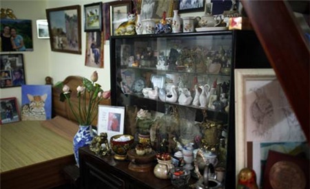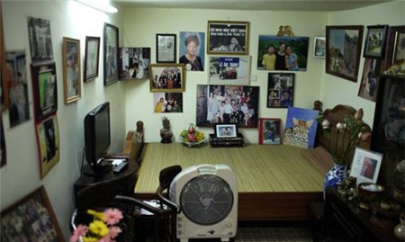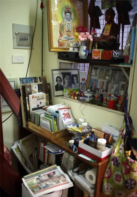 | Đây là một góc nhỏ nghệ sĩ Lê Mai lưu giữ những bức di ảnh của gia đình và thờ Phật. Phía dưới là nơi bà cất những bài báo, bức ảnh. |