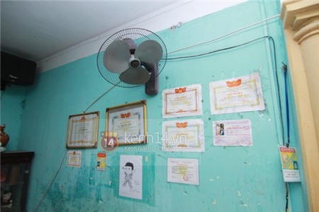 Trên tường trêu rất nhiều bằng khen, giấy khen của Quang Anh. Đặc biệt, còn có cả một bức tranh phác họa hình ảnh cậu bé đi thi The Voice Kids do một người bạn vẽ tặng.