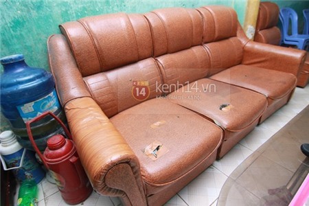 Bộ ghế sô pha cũ với nhiều vết rách được dán băng dính lên là của một người bạn tặng mẹ con Quang Anh.