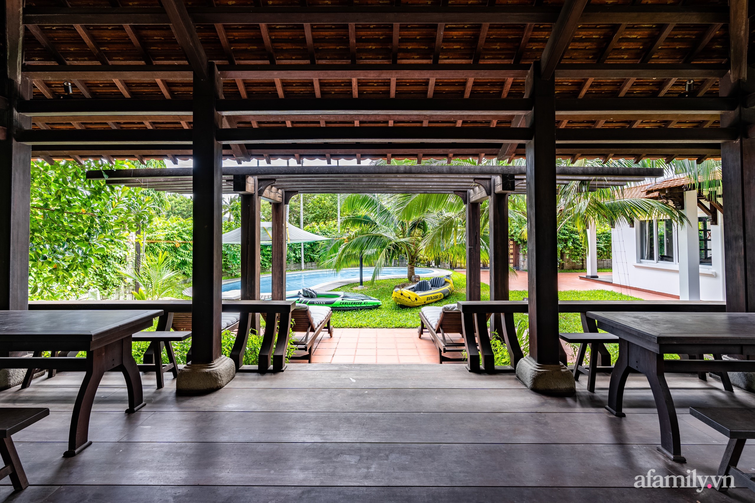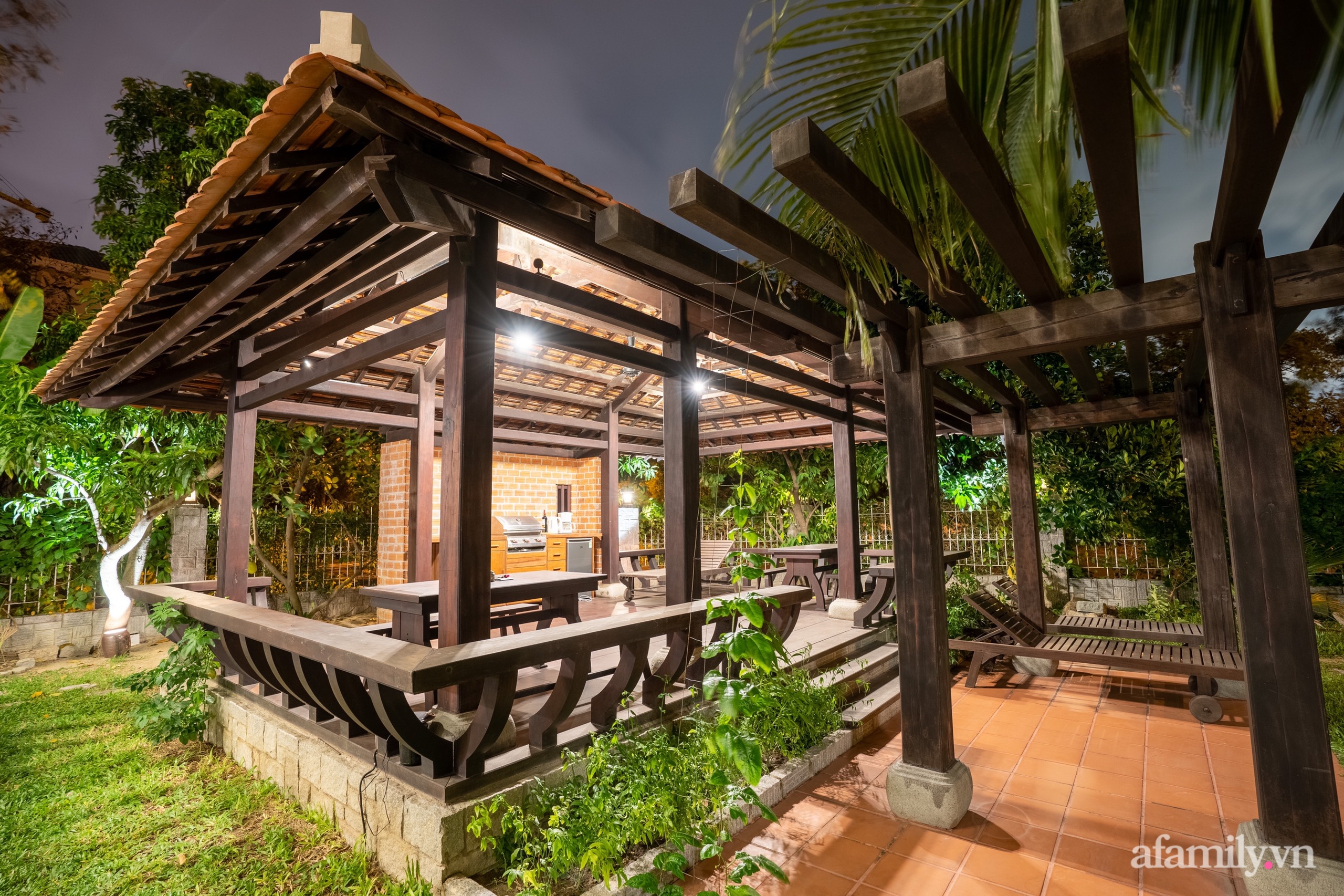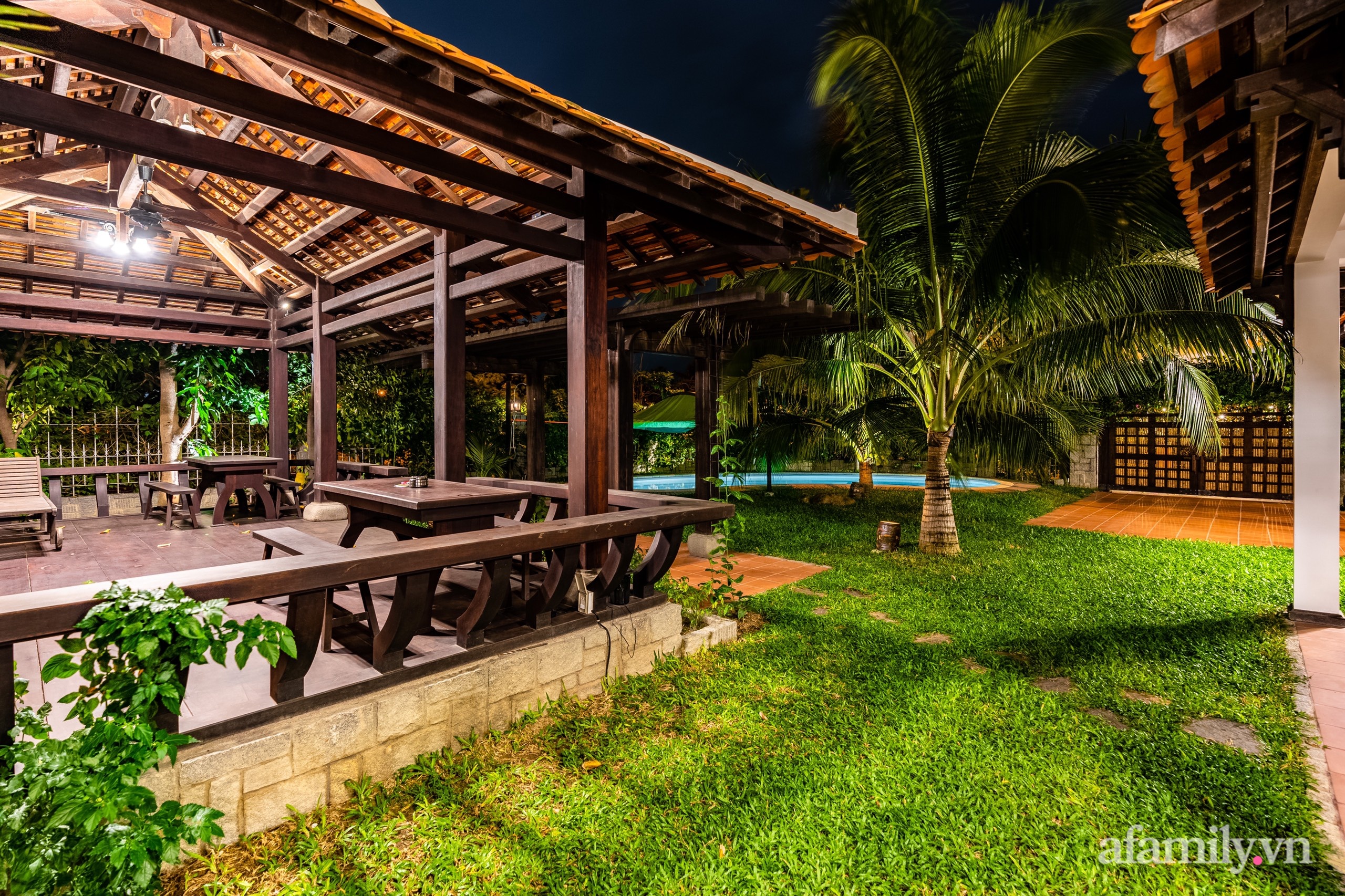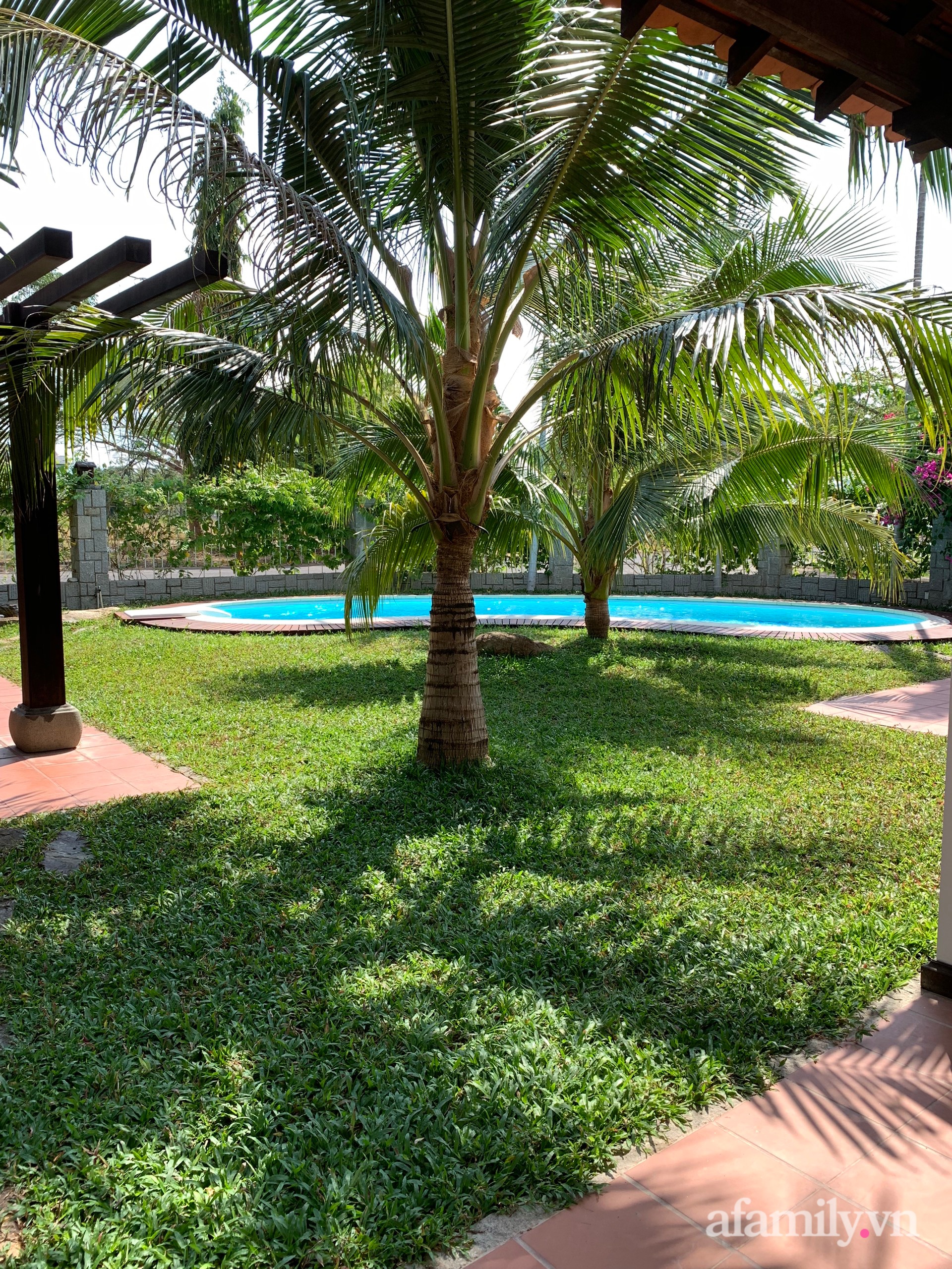Trong khuôn viên mảnh đất còn được xây dựng 1 chòi (nhà mát), hồ bơi, thảm cỏ và rất nhiều cây ăn quả, cây cảnh bao quanh. Hàng rào quanh nhà được phủ kín bằng các loại cây dây leo có hoa, vừa đảm bảo độ riêng tư cho gia đình cũng vừa trang trí thêm cho ngôi nhà thêm gần gũi với thiên nhiên, bình dị với nét đẹp từ cây cỏ.