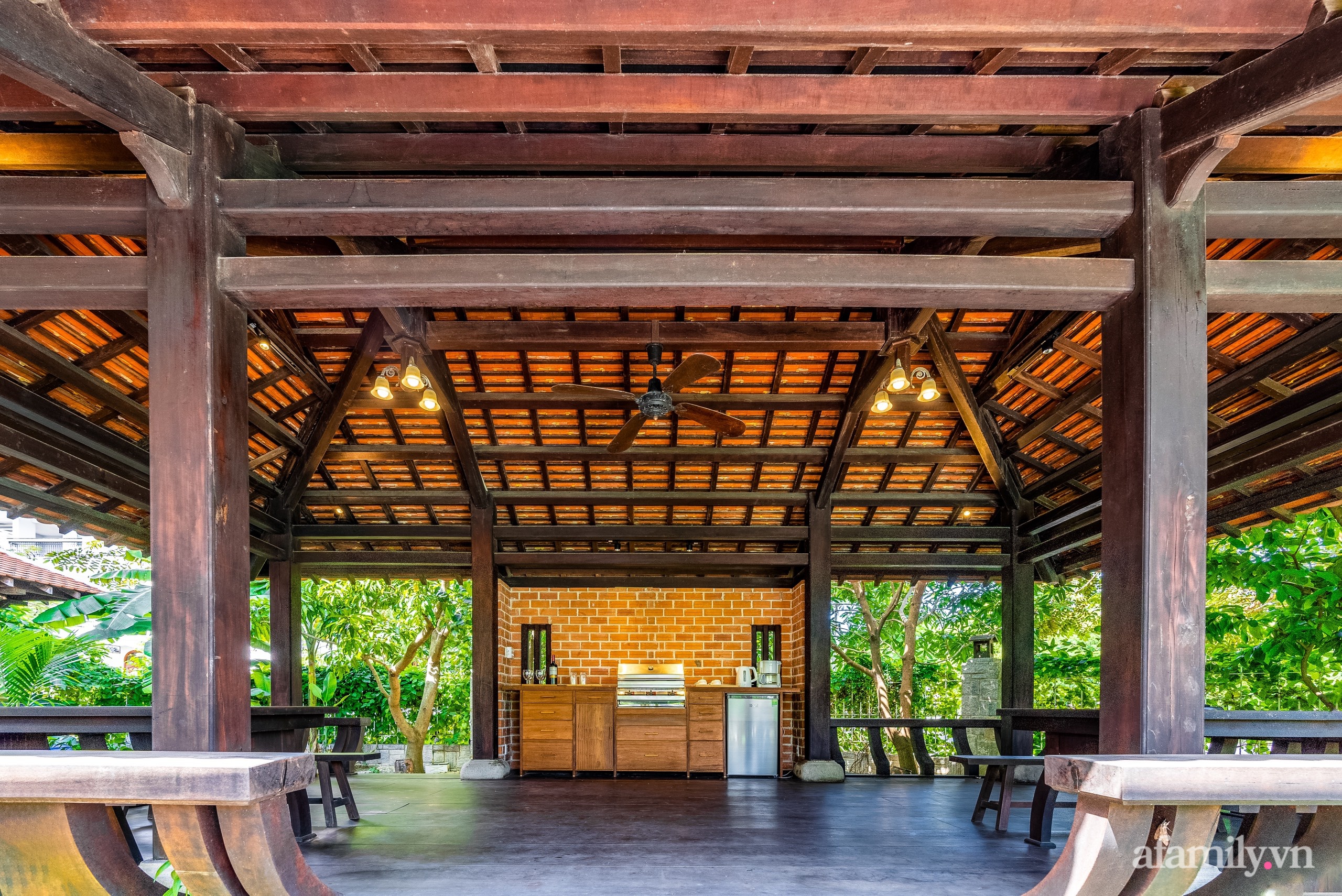 Góc nhỏ ấn tượng nổi bật trong vườn nhờ mái đỏ và khung gỗ.
