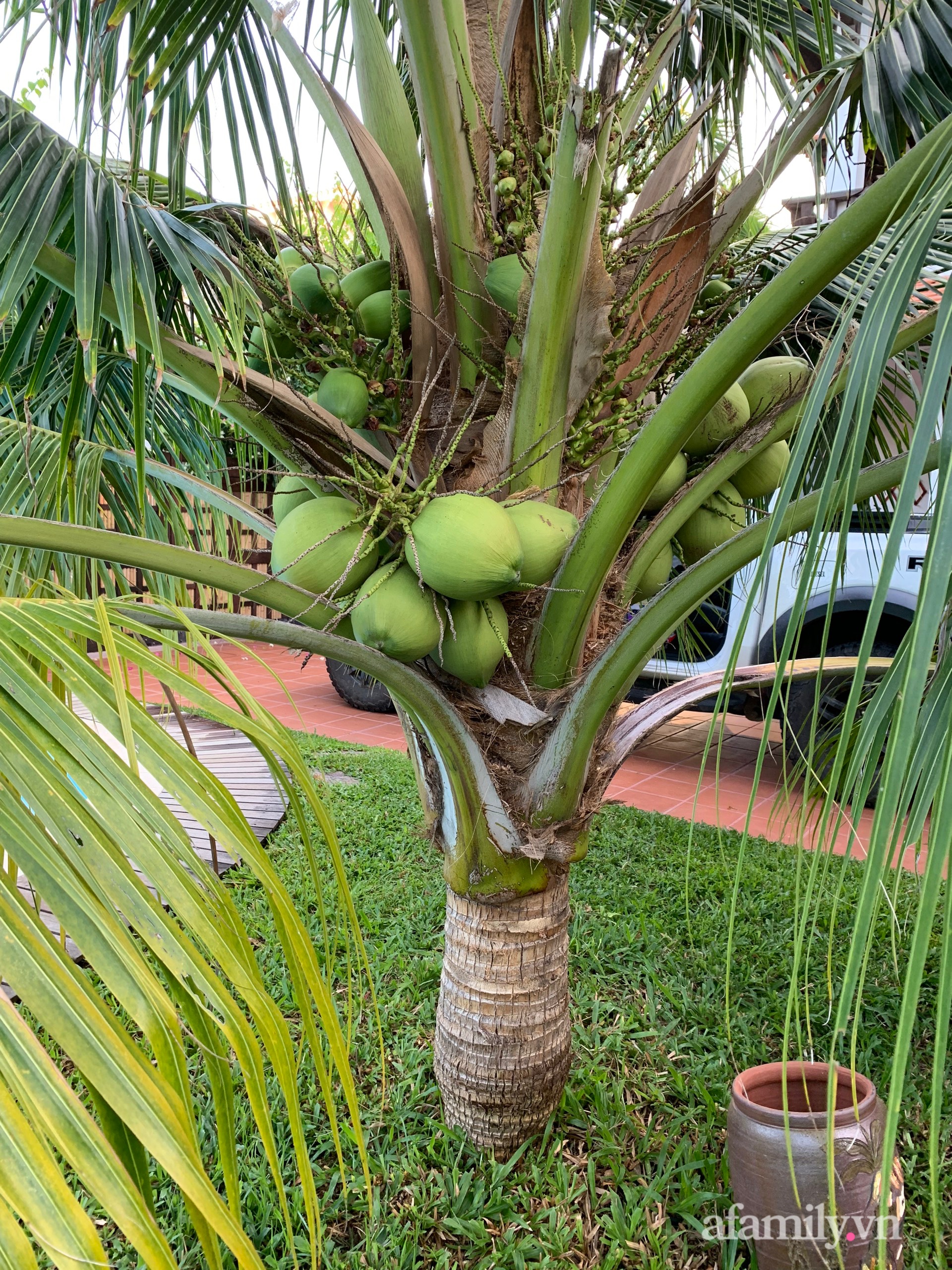 Dừa Bến Tre là một trong những loại cây ăn quả bố chồng chị sưu tầm về trồng trong khu vườn.
