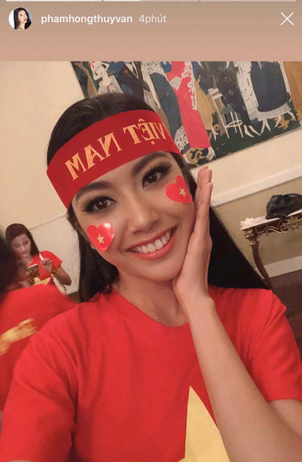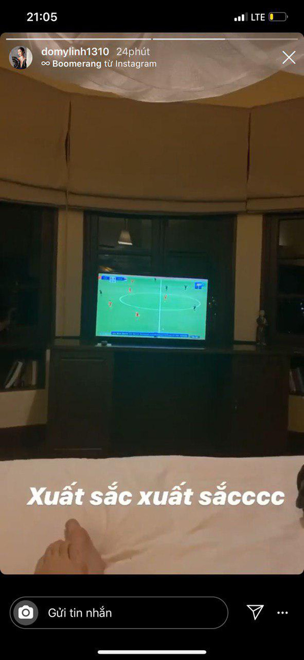 Hoa hậu Đỗ Mỹ Linh cũng theo dõi trận đấu hôm nay, vỡ òa trước màn cản phá quá xuất sắc của Đặng Văn Lâm.