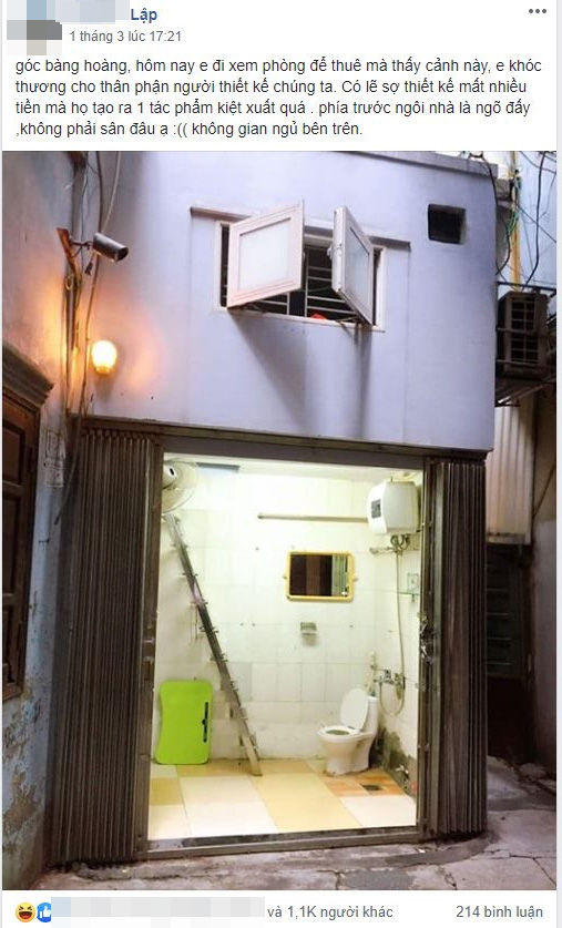"Góc bàng hoàng. Hôm nay em đi xem phòng để thuê mà thấy cảnh này, em khóc thương cho thân phận người thiết kế. Có lẽ sợ mất nhiều tiền mà họ tạo ra một tác phẩm "kiệt xuất" quá. Phía trước ngôi nhà là ngõ đấy, không phải sân đâu. Không gian ngủ bên trên".