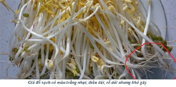 Vẫn theo PGS.TS Nguyễn Duy Thịnh, một mẻ giá đỗ làm theo đúng quy trình sẽ mất từ 4-5 ngày còn giá ngậm thuốc kích thích chỉ mất từ 1-2 ngày. Vì vậy, giá ngậm thuốc có rất ít rễ. Bạn chỉ cần nhìn vào rễ của giá là có thể phân biệt được giá sạch hay không. Cụ thể, giá ngâm thuốc có thân dài, ít rễ hoặc không có rễ, màu trắng bắt mắt. Giá sạch có rất nhiều rễ, thân cong queo, không bóng, không to, không mập. Bạn nên chọn cọng giá có độ dài khoảng 2-3 cm.