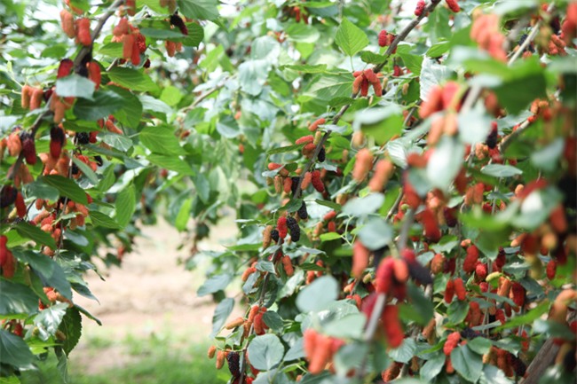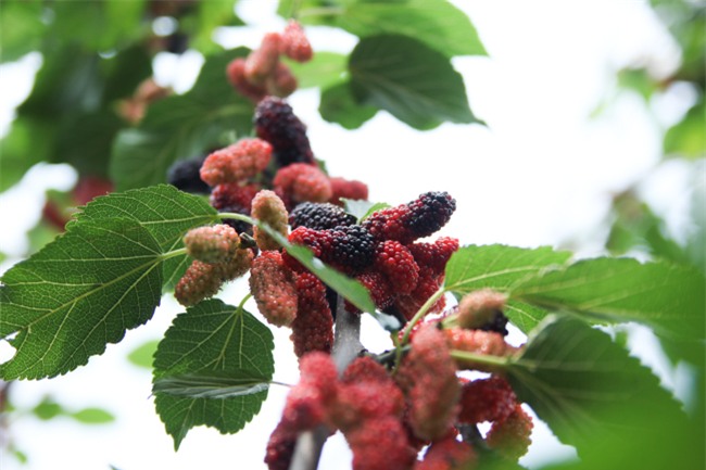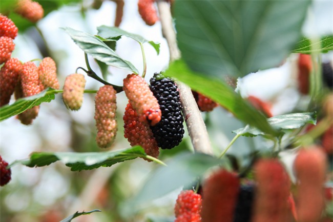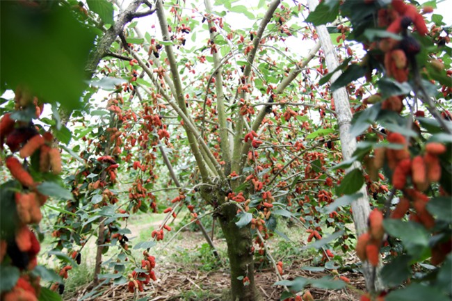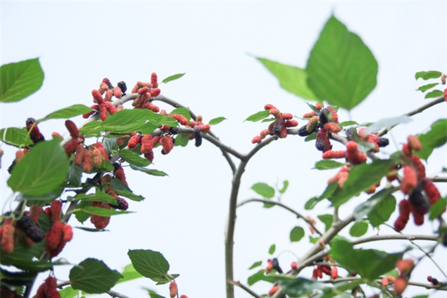 Cây dâu ra quả sai trĩu. Bản thân ông Dần cũng không biết giống dâu tằm lai này có nguồn gốc từ đâu vì ông đi xin cành của một người ở cùng làng đem về trồng.