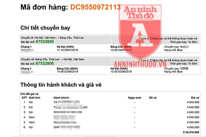 “Đó là mức giá rất hấp dẫn, nên chúng tôi đã gửi thông tin cá nhân cho T.D đặt vé. Sau đó, người này gửi tới email của tôi một file PDF có nội dung là ‘mã đơn hàng’, để tạo niềm tin rằng đã đặt vé. Điều kỳ lạ là thông tin cho thấy giá vé mỗi người tới 4 triệu đồng, tổng là hơn 24 triệu đồng. Song T.D nói với chúng tôi rằng, anh ta đã ứng tiền trước và… chịu lỗ trong đơn hàng này”, chị P.T cho biết thêm.