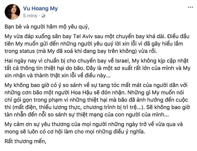 Trớ trêu thay, chỉ hai ngày sau khi "răn dạy" đàn em, chính Á hậu Hoàng My lại vướng vào lùm xùm vì phát ngôn của mình trên trang cá nhân. Dòng trạng thái so sánh giữa thiệt hại bão lũ và "thiệt hại Hoa hậu" đã nhận vô vàn "gạch đá" từ cộng đồng mạng khiến cô ngay lập tức phải gửi lời xin lỗi.