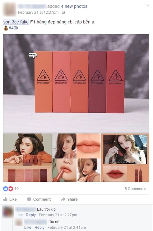 | Không cần quan tâm đến nguồn gốc, xuất xứ, khách hàng này chỉ thắc mắc xem cây son 3CE fake 40.000 đồng có lâu trôi hay không. |